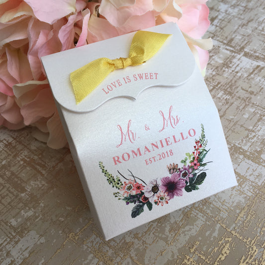 Square Favor boxes with Customizable Tags and Color Ribbons.