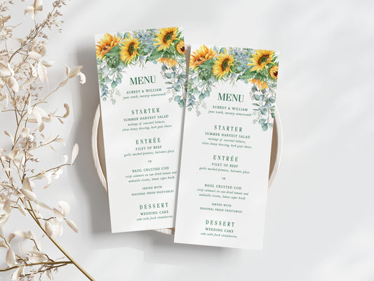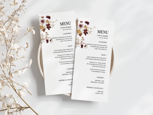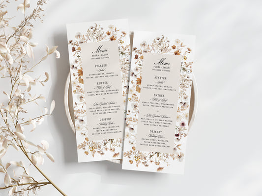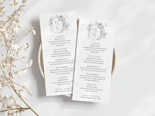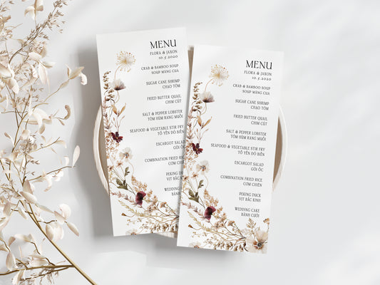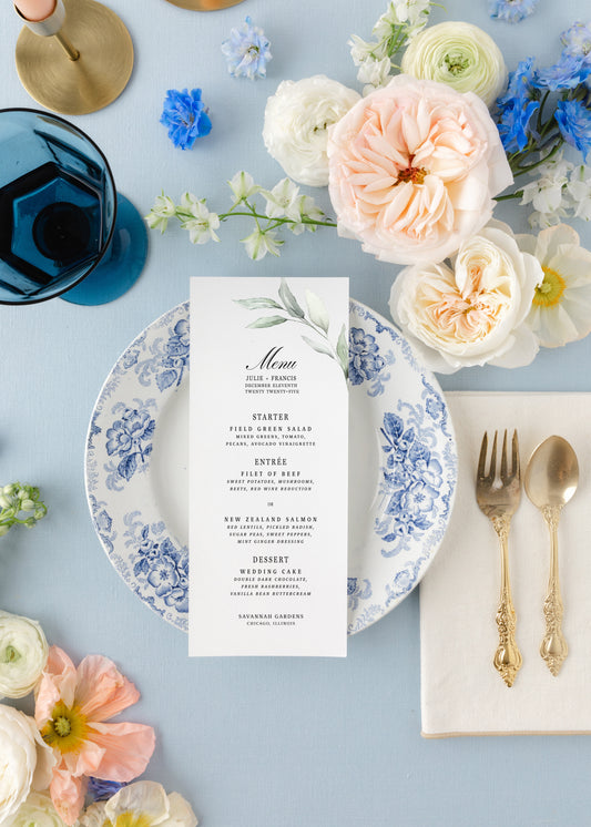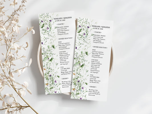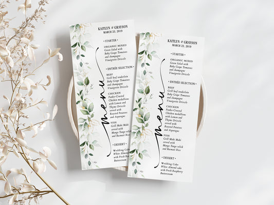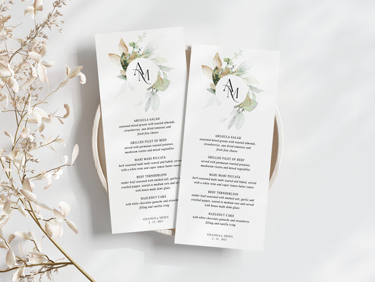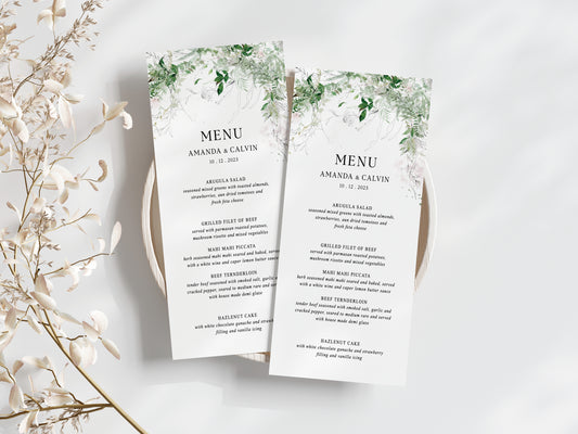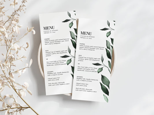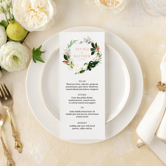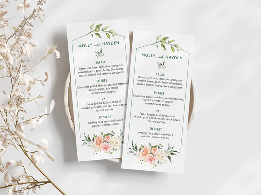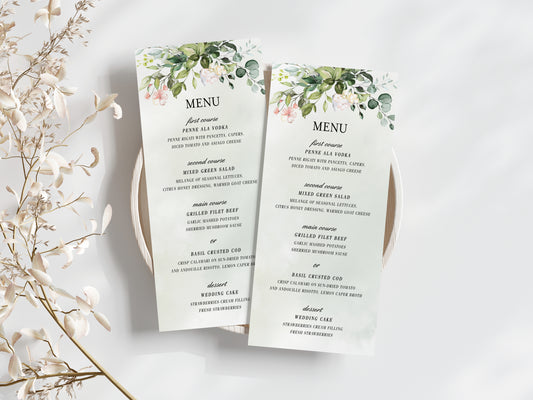 Compliment your wedding reception with these wedding menus featuring florals and greenery designs. They are perfect for wrapping in a napkin or placing on the center of plate.