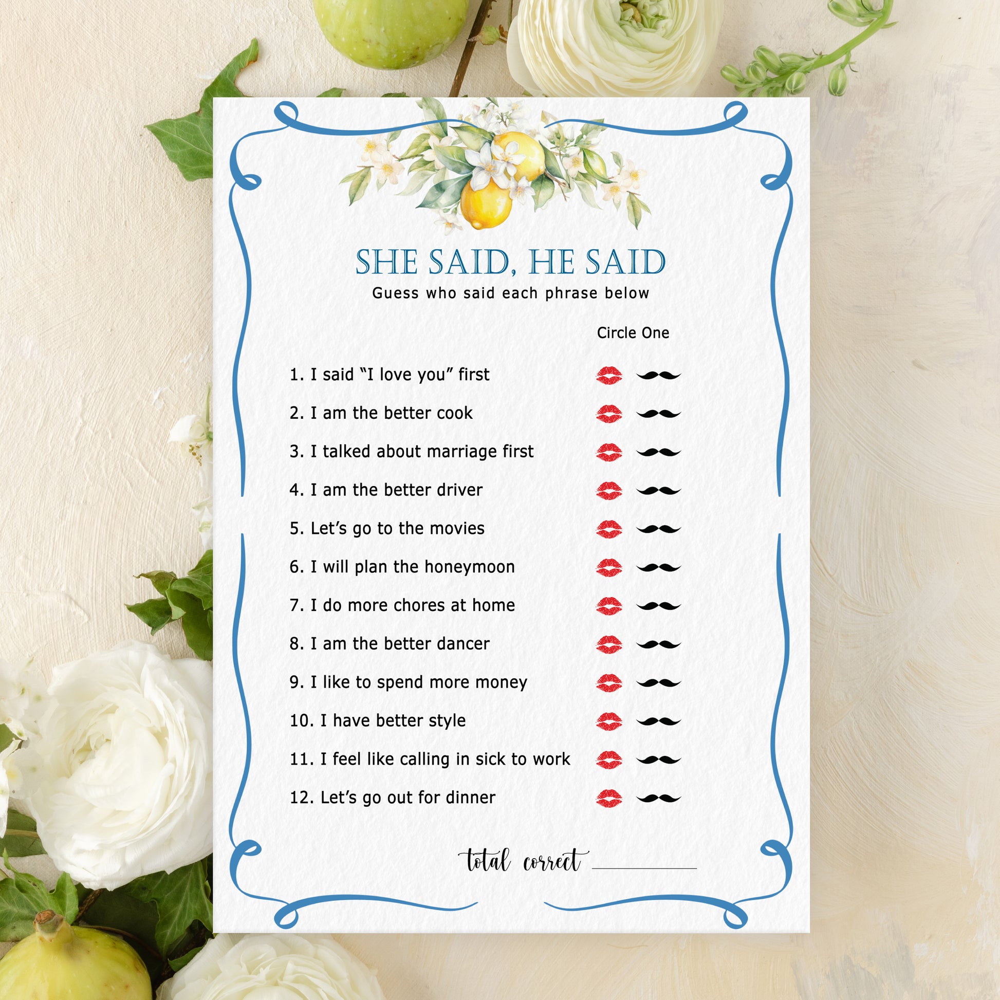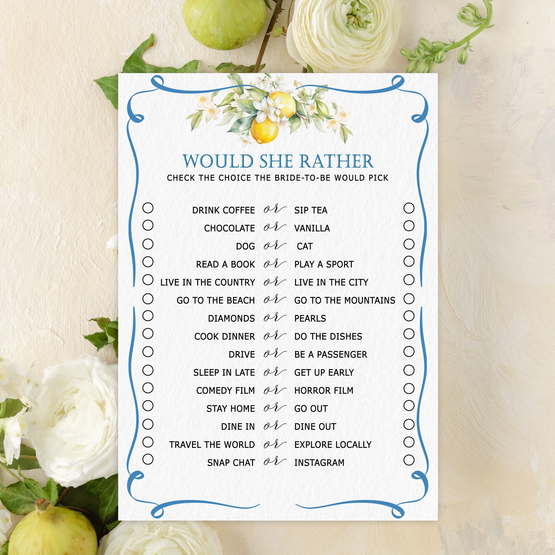Blue Citrus Lemon Bridal Shower Game Cards