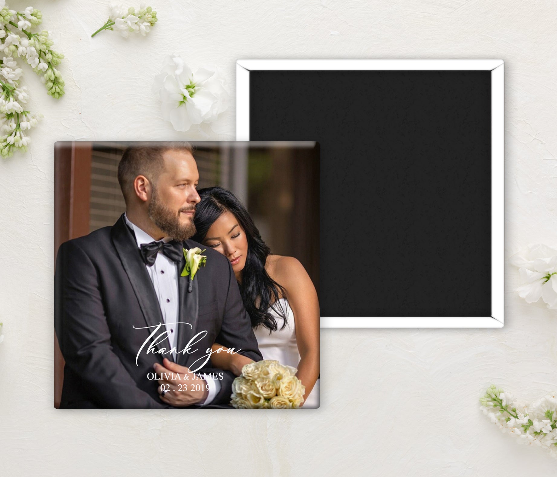* 3" Square Photo Magnet Button - featuring your selected photo and design with customizable layout, fonts, & color palette to match your wedding theme.