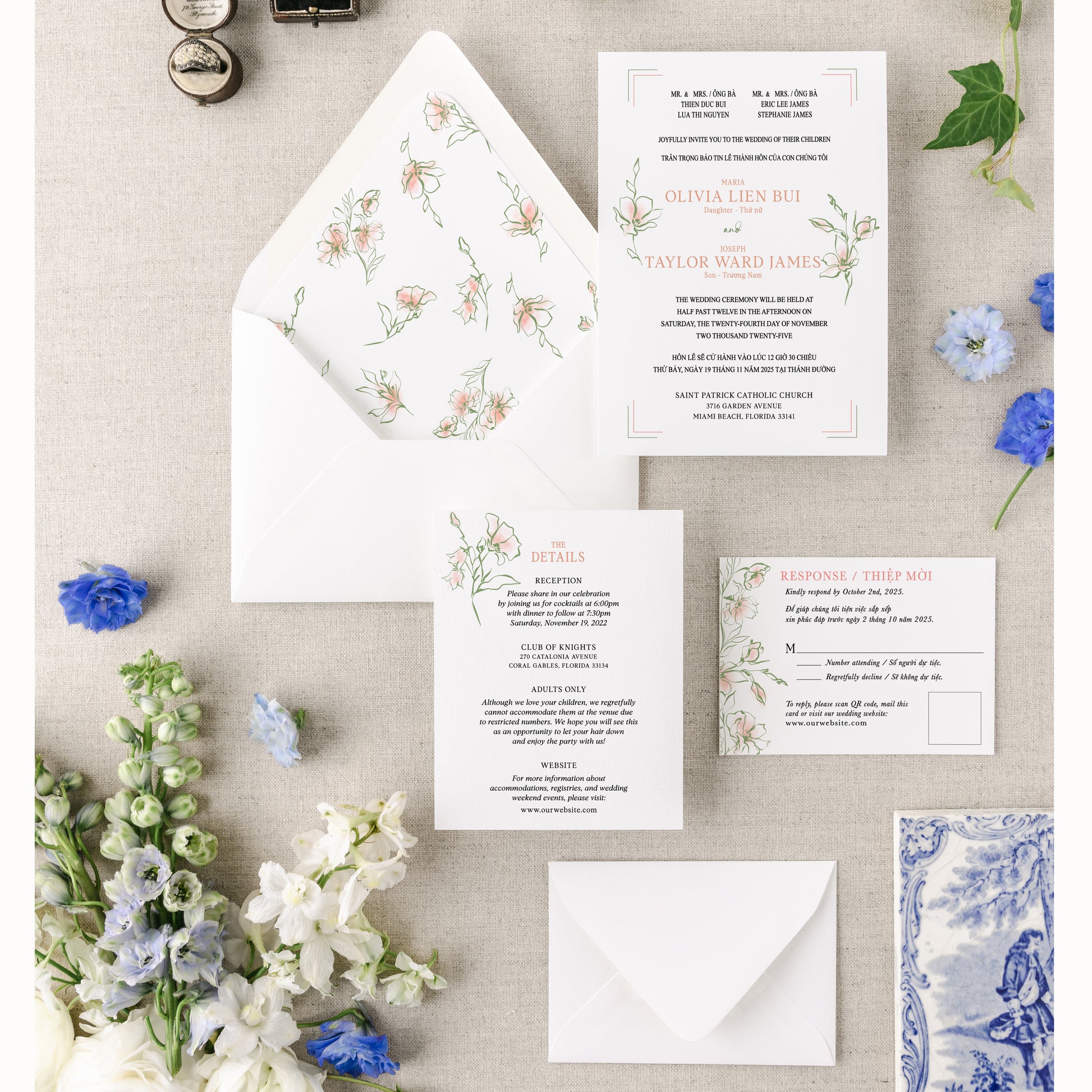 CHARLIZE | Bilingual Vietnamese Wedding Invitation Suite Bundle with 3" Square Photo Magnet Button Option