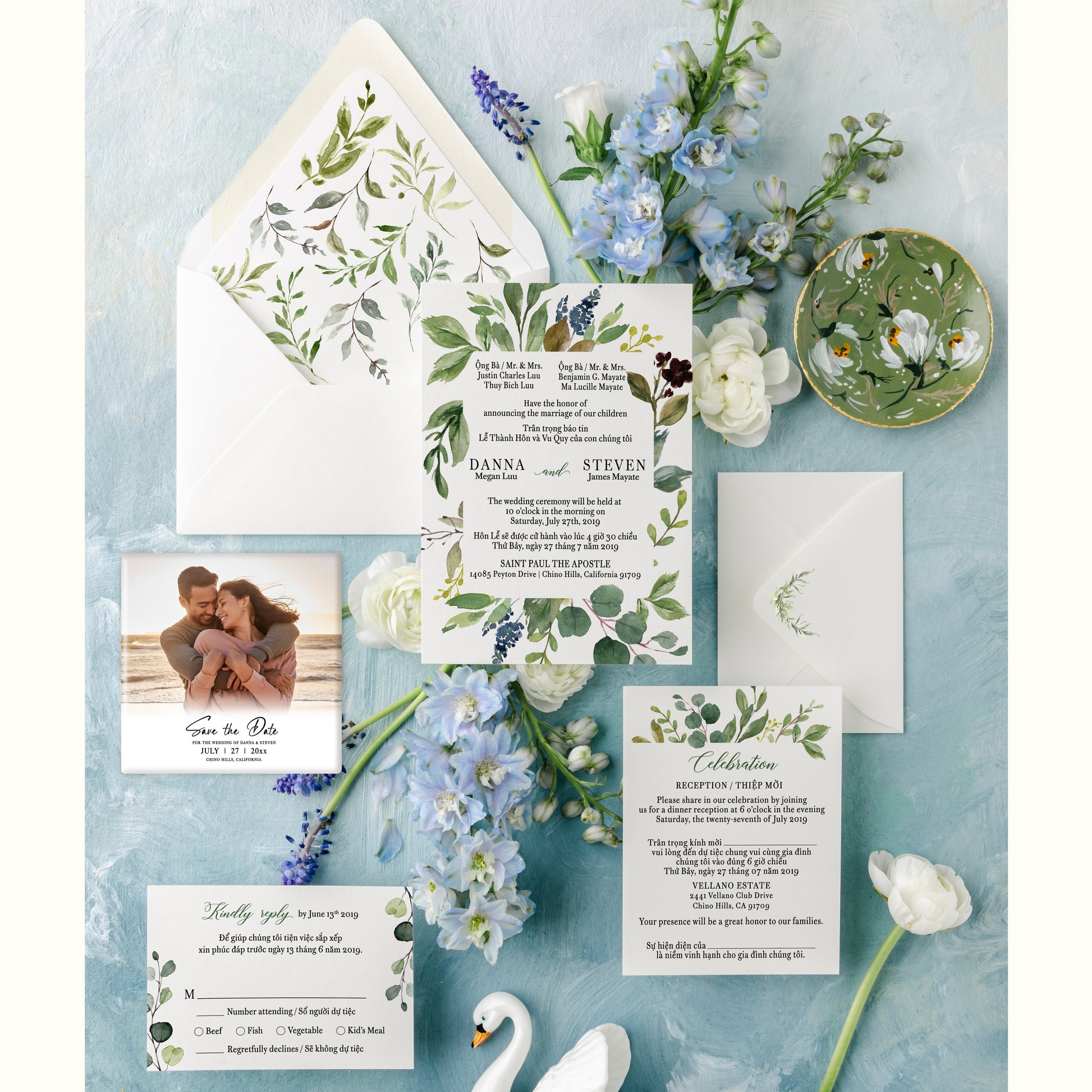 CHLOE | Bilingual Vietnamese Wedding Invitation Suite Bundle with 3" Square Photo Magnet Button Option
