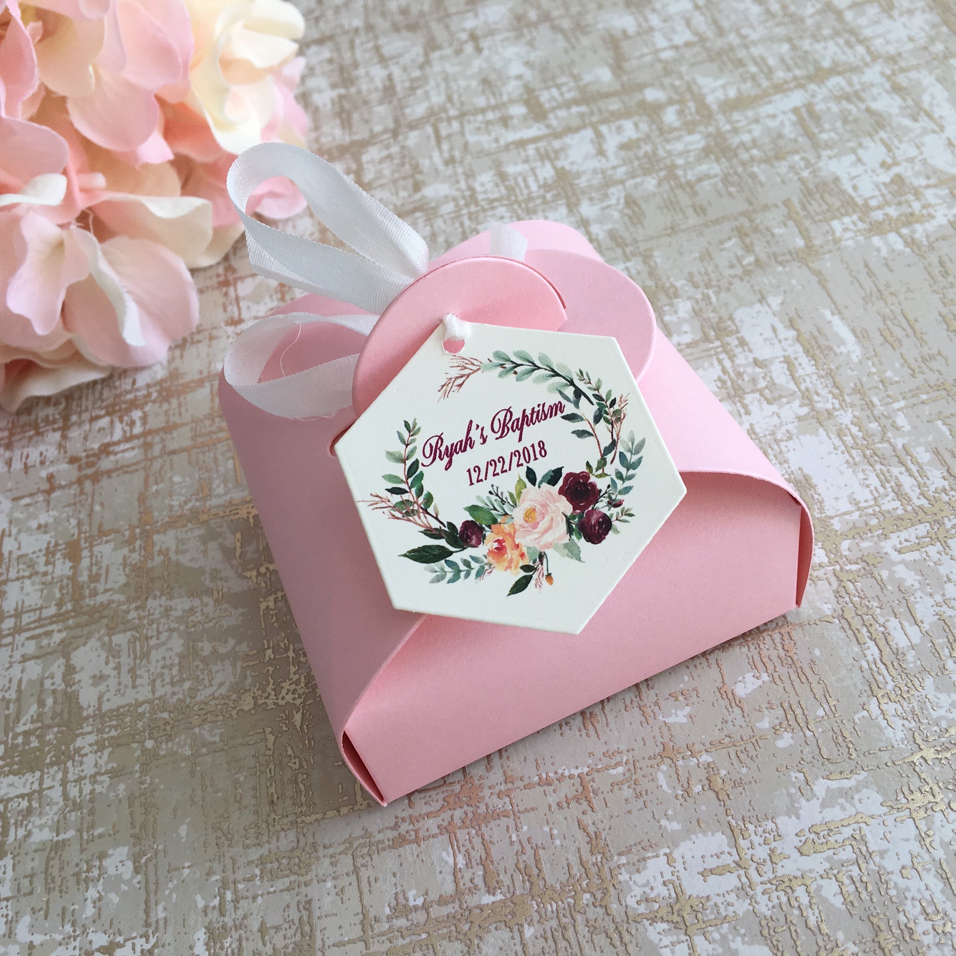 Curvy Keepsake Favor boxes with Customizable Tags and Color Ribbons.