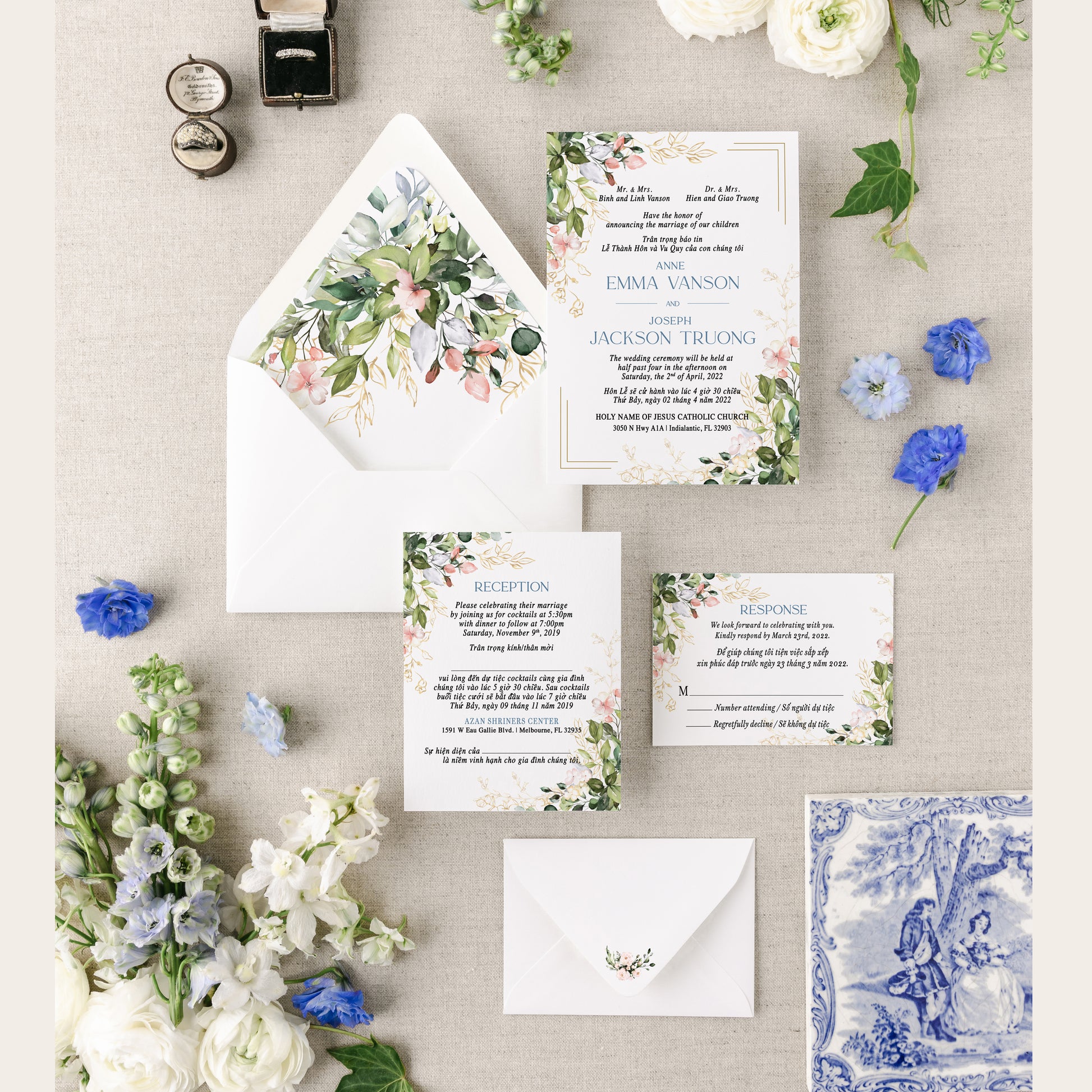 RACHEL | Bilingual Vietnamese Wedding Invitation Suite Bundle with 3" Square Photo Magnet Button Option