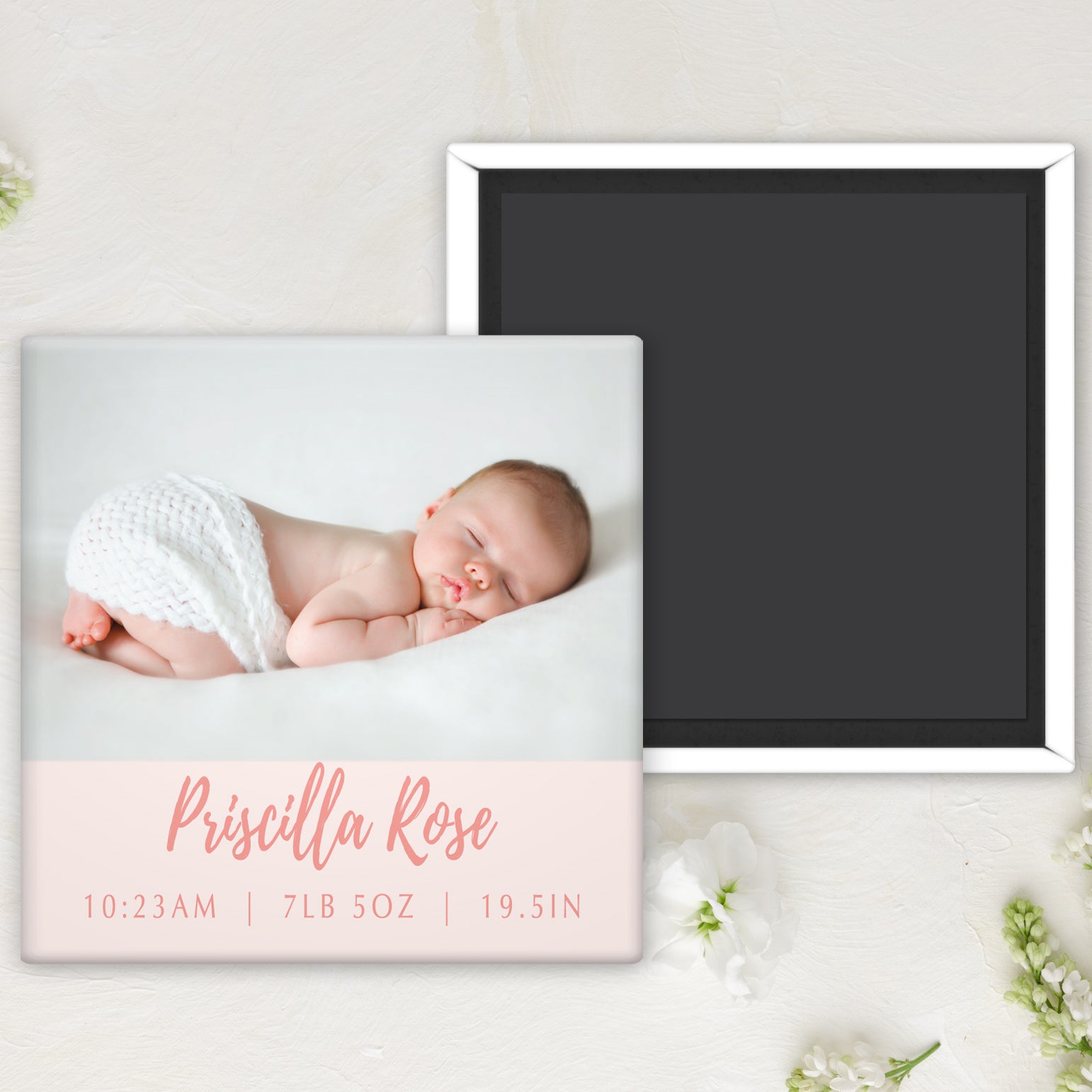 Celebrate your baby's arrival with a personalized birth announcement photo magnet button - a sweet and thoughtful way to share your joyful news with family and friends. Featuring your little one's photo, name, birth date, and details, this custom magnet doubles as a lasting keepsake they can proudly display on their fridge.